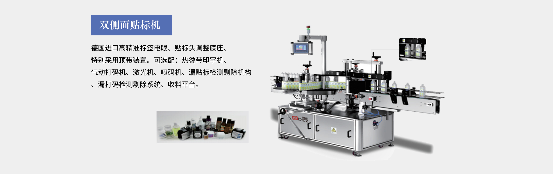 本公司生產(chǎn)的口服液貼標(biāo)機(jī)適合細(xì)長(zhǎng)形圓柱體瓶圓周表面的不干膠標(biāo)簽自動(dòng)貼標(biāo),口服液瓶等,采用彩色人機(jī)界面,離合器設(shè)計(jì),使標(biāo)簽張緊力更加穩(wěn)定,便于提高貼標(biāo)精度3、西門子PLC控制,德國、日本光眼,高精度步進(jìn),貼標(biāo)速度可達(dá)30米/分鐘,可加裝色帶打碼機(jī)、或者熱轉(zhuǎn)印機(jī)??诜嘿N標(biāo)機(jī)多為圓瓶貼標(biāo)機(jī)適用于瓶身長(zhǎng),直徑的產(chǎn)品(玻璃塑料都可以,材質(zhì)不限),同時(shí)可加工粉針劑瓶、采血管、水針劑瓶、眼藥水瓶、圓管等,專門針對(duì)...